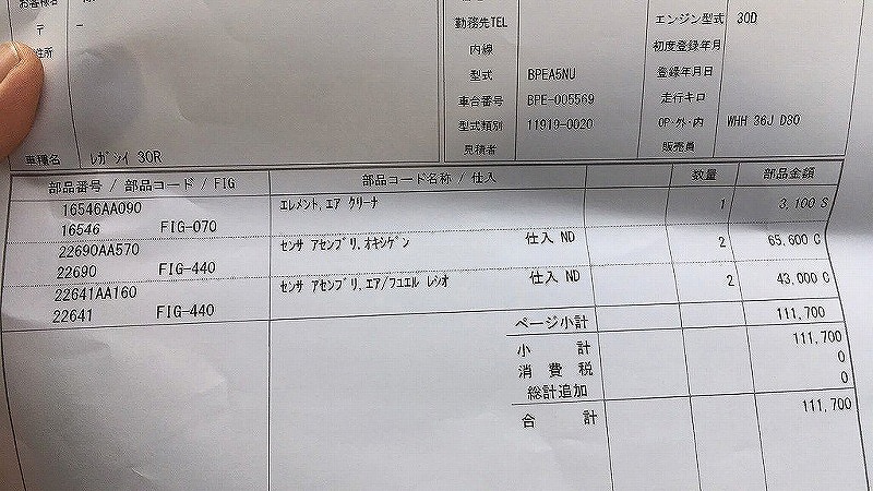コードがわからないなりに部品の値段を調べましたオキシゲンセンサー2個65,000円 2個エアフユエル43,000円